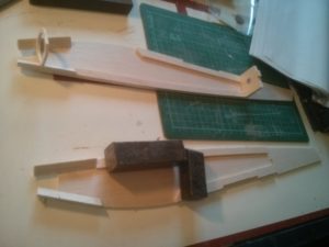 Die Nasenleiste ist aus Kiefer und Pfofilgefräst also aufpassen beim ankleben. Beim Hangfliegen im hohen Gras/Gestrüpp hat es erstaunliche Vorteile weil es weniger Dellen gibt und außerdem übernimmt die kleine Leist auch eine Stabilitätsfunktion. Die Querruder gehen über die gesamte Spannweite und bestehen aus einer Dreikantleiste.